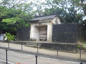 | 道路脇にある園比屋武御嶽石門。思ったより地味なので、うっかり見過ごしてしまいそうなたたずまいである。 | |