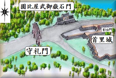 園比屋武御嶽(そのひゃんうたき)石門は、守礼門のすぐ北東部の道路沿いにある。ちょうど首里城の歓会門と守礼門との中間くらいの道路脇にある。あまり目立たないので見過ごしてしまいそうだが、これも世界遺産に登録されている遺跡の1つである。