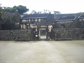 | 識名園の正門。以外に素朴な門である。 | 御殿に向かう途中にある虎口状の石垣。 |