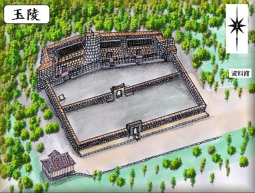 玉領は、二重の門の内部にある。門をくぐると、正面には石垣を用いた巨大な石室が見えている。王家の墓所らしく、実に立派なものである。石室は宮殿をかたどった形状をしている。