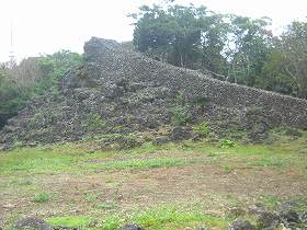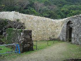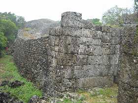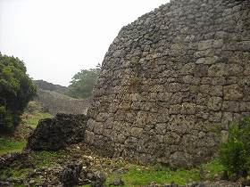 城の北側の城壁は低いものにすぎず、西側や南側は天然の斜面だけによる防備となっている。東側が台地続きになっており、そちら側に防御を集中させたという構造であるが、東側の城塁が非常に見事であるのに対して、それ以外の部分はあまりぱっとしないグスクである。一点豪華主義と言ってもよさそうな割り切り方である。