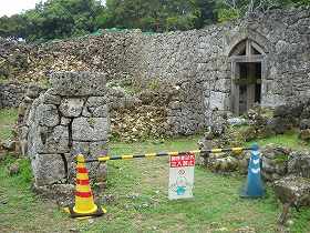 | 裏門。こちらは修復工事中のためか、立入禁止になっていた。 | 知念城の手前にあるノロ屋敷跡の石垣。ノロとは、琉球王朝によってつくられた「祝女」のことであるという。 |