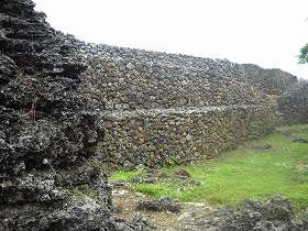 | 糸数城入口の石垣。この辺はわりと低い。 | 正門入口脇の石垣を裏手から見たところ。2段の犬走りがある。 |