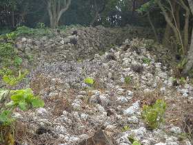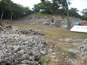 そこを上がると案内板も設置されているのだが、やはり崩落した石が転がっているだけで、ちゃんとした石垣は南西辺りにしか見られなくなってしまっている。どうやら、第2次大戦中にそのほとんどが破壊されてしまったことによるものらしい。南部地域は激戦場となったわけなので、このようなグスクも近代的な砲撃によってそうとうやられてしまったものであろう。