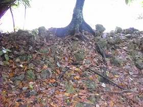 そちらのほうに進んでいくと、登城道と思われる道の脇に無数の石が転がっている。しかし、石垣といった形態は成しておらず、ひたすら石が転がっているというだけの形状である。