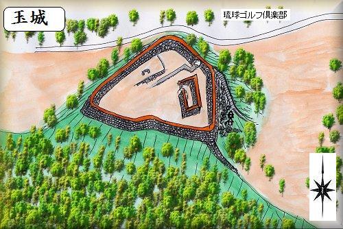 玉城は琉球ゴルフクラブのすぐ南側にある。ゴルフクラブからの比高は20mほどだが、南側の台地下からだと比高160mほどと、かなり高い位置にある。