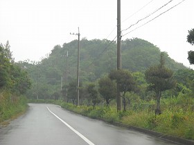 | 西側から見た玉城。台地側からの比高は20mほど、南側の山麓からの比高は50mほどある。 | 虎口に続く石段・・・といっても、ほとんど天然の岩場である。 |