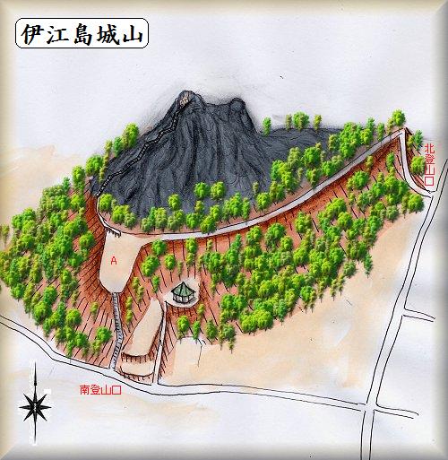 山頂部はそれだけのものであるが、南側の中腹に、Aの平場がある。30m×60mほどの広さがあり、籠城用の曲輪として使用するとすれば、ここがその場所であったであろう。この周囲も急峻な地形となっている。島はとても平坦な地形なので、合戦などが起こった際に島民が避難する場所としては、ここがもっともふさわしいといえる。