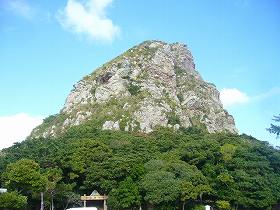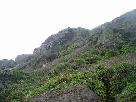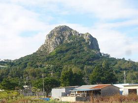 | 伊江島に向かうフェリーから見た城(ぐすく)山。タッチューとも呼ばれている。標高は172mほどある。 | 南側の山麓から見た城山。みるからに険しい岩山である。ここからの比高は100mほど。 |