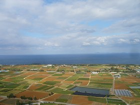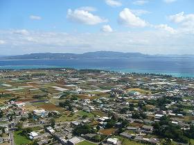 | Aの平場から見た城山。lここからの比高は40mほどである。とても登れなさそうに見えるが、山頂まで石段があり、10分ほどで登れる。 | 山頂から見た景色。東南の伊江ビーチの方である。奥に見えるのが沖縄本島の国頭半島。 |
