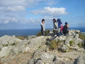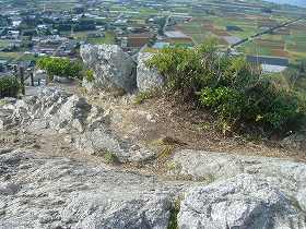 | 北側を見たところ。伊江島が平坦な島であることがよく分かる。正面奥にかすかに見えているのは伊是名島であろう。 | 山頂。山頂は岩ばかりで、曲輪を置くほどのスペースはないし、建物を建てるのも不可能である。かろうじて物見に使用することができるくらいのものである。 |