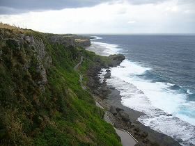| 下の売店のあるAの平場を見下ろしたところ。城の曲輪を置くとしたらここであろう。 | 城山を降りて、北海岸の湧出(わじー)展望台にやってきた。緩やかな珊瑚礁の南海岸と違って、北側は断崖絶壁である。 |