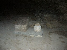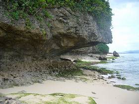 | 断崖絶壁の下に降りてみた。ちょうど正面上に見えるのが、右上の写真を撮影した場所(湧出展望台)である。かなり高い断崖だ。 | 今度は南岸のニャティヤ洞にやってきた。洞窟の中には力石と呼ばれる石がある。これを持ち上げて軽く感じたら女の子、重く感じたら男の子が生まれるという。 |
