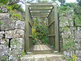 | 2郭内部から見た2郭城塁。 | 1郭入口の石門。旧態のまま見事に保存されている。 |