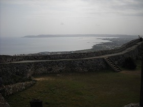 | 2郭城塁を上から見たところ。上から見ると、けっこうな高さがある。 | 2郭城塁から見た平安座島。ここへ渡るために海中道路が付けられているのだが、これを車で走るのが楽しかった! |