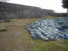 | 1郭内部の城塁。 | 崩された部分では復元工事が行われ、その部分が白く新しい石垣になっていた。内部には細かな中込石がたくさんつまっている。 |