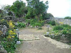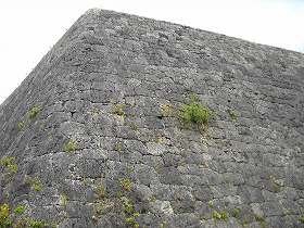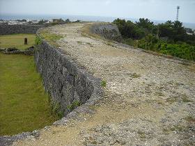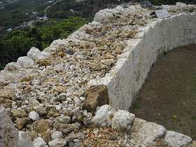 | 3郭城塁脇にある裏門。護佐丸の城ではおなじみの石門である。 | 石門脇の城塁。かなり崩されてしまっている。 |