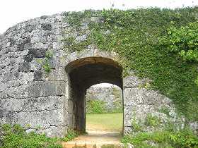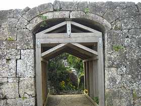 | 座喜味城2郭石門脇の城塁。 | 2郭石門。沖縄のグスクで最古の石門であるという。 |