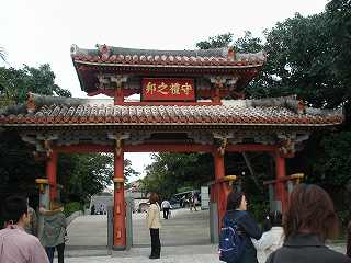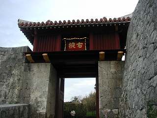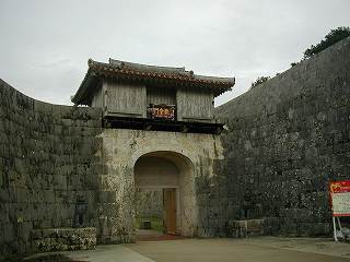 | 駐車場から土産物の並ぶ中を進んでいくと、まず見えてくるのがこの守礼門である。 | 歓待門。実質的な大手門である。 |