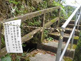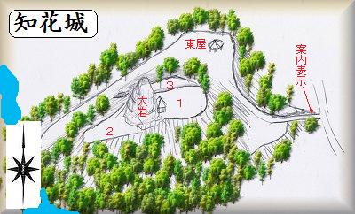 郭1の東屋の所から、大岩に登るための遊歩道が付けられている。しかし、古びてしまっており人もあまり通らなくなっているせいか、遊歩道の鉄パイプがだいぶ錆びてしまっている。それで崩落の危険性があるため通行禁止となってしまっていた。もっとも、岩の上であるから、たいした平場ではないだろう。ただし、眺望は良さそうで、ここがこの城の拝所であったものと思われる。googlemapmp航空写真を見ると、この岩の上にも展望台のようなものが設置されているようだ。