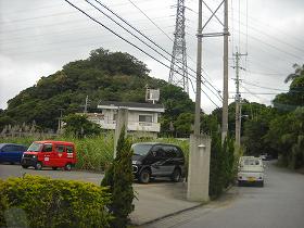 | 東側から見た知花城跡。比高30mほどの独立山である。 | 山頂にある岩の登り口。危険だと言うことで立ち入り禁止になってしまっていた。 |