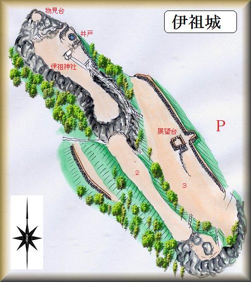 伊祖神社のある一角は南北に細長い郭となっており、鳥居の建つ入口の周辺には石垣が積まれ虎口を形成していた。神社の背後には石組みの井戸があり、またその奥は一段高い岩場となっている。ここが物見台というべき個所であり、ここに立つと浦添市内を一望することができる。