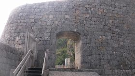 それを過ぎると間もなく眼前に立派な城壁がそびえているのが目に入ってくる。これが浦添グスクの主郭内部入口の城壁である。ただし、石積みはかなり新しいものに見える。浦添グスクの石垣は首里城建設の際に取り払われて運ばれた上に、第2次大戦では米軍の攻撃を受けて、ほとんど壊滅状態になってしまった。近年になって復元工事が進められるようになったものであろう。
