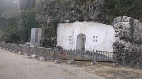 | リベンジでようどれも訪れることができた。ようどれは浦添城の北側の斜面下にある。写真はようどれの入口に当たる前庭。 | 北側下から見たようどれ。こうしてみるとまさに城郭造りであることが分かる。一番上の城塁jは浦添城の入口の石垣である。 |