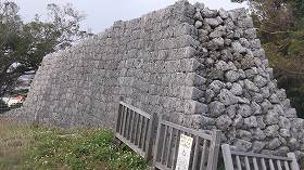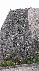 | 駐車場の上の公園内にある石垣作りの展望台。 | 展望台下の城塁には張り出し構造が見られる。 |