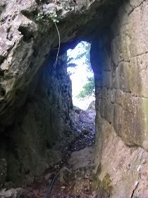 | 東側の広場から見た城址。非常に分かりにくいが、写真左手の所に登り口がある。 | 1郭内部に入る虎口。岩をくり抜いたもので、人一人がやっと通れるほどの狭さである。右手には石積みがある。 |