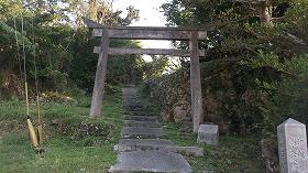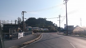 正面奥には2段構造の高台が見えている。ここが物見台とでもいうべき個所で、この上にも拝所が設置されていた。物見台の上は石灰岩質の平場となっている。ここからの眺望は素晴らしく、山下の集落やその先の海などかなり遠くまで見晴るかすことができる。また、すぐ下を通っている高速道路や国道バイパスもよく見えている。