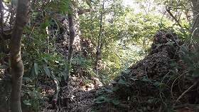 しかし、頂上部には郭と呼べるようなスペースはなかった。岩の間に挟まれたわずかな空間があるだけである。とはいえ、そこはいかにも神聖な場所に思われ、このグスクの拝所がここであったのだろうと思われた。(しかし、後でネットでこのグスクのことを検索してみたら(グスクみちの兼箇段グスクのページ)、この先にちょっとしたスペースがあるということを知ることができた。ちょっとヤブのようになっていたので進入ははばかられたのである。そここそが主郭というべきであったかもしれない。あるいは物見台的な場所なのかもしれないが)