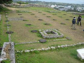 かつての発掘調査では、郭内からは多数の柱跡が検出されているということで、郭内部はかなり居住性の高い空間であったようだ。また国産や中国産の土器も採取されており、ここでの生活ぶりを垣間見ることができる。13世紀から15世紀にかけてのものが多く出土しているとのことで、かなり長い期間にわたって生活空間として用いられてきたグスクであったと考えられる。