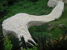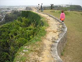 安慶名城は、連郭式の城が多い沖縄のグスクの中では珍しい環郭式のグスクであるという。確かに、主郭の周囲に腰曲輪をめぐらせたグスクは珍しいように思う。しかし、周囲の郭といっても、細長い帯曲輪にしか過ぎないものであり、これを環郭式というにはちょっと違うなといった印象を受ける。どちらかというと、環郭式の縄張を意図したというものではなく、地形なりに城塁をめぐらせたらこのような形状になった、という方が合っているように思われる。
