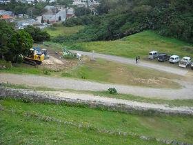 | 2郭への石段から見た1郭城塁。 | 下では4郭の城塁の復元工事が行われていた。 |