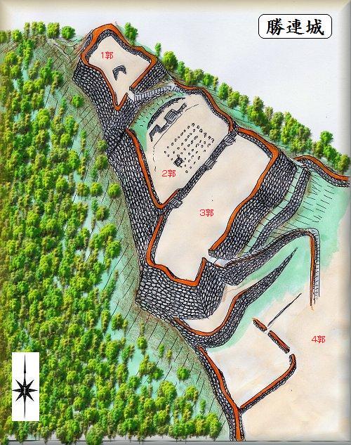 | 3郭から見た2郭石垣と1郭城塁。 | 3郭から下の4郭内部の石垣を見たところ。 |