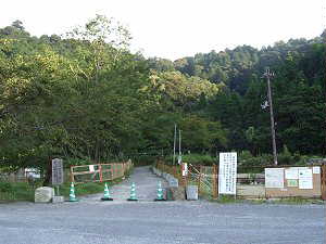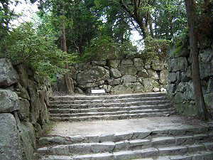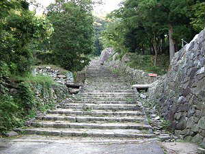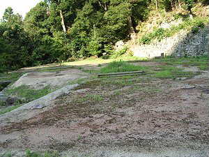 | 安土城の大手口。発掘調査が行われているようだ。 | 大手口の石段。両脇には深い溝がある。以前来た時にはこんなに石段がはっきりしていなかったが、発掘によって、旧状が復元された。 |