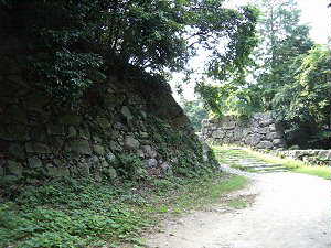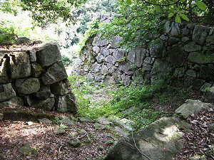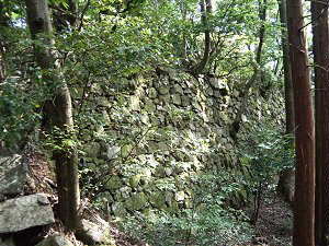 | 天守台北側の搦め手口。石垣には何段にも折れが入っている。 | 八角平の石垣。高さ6mほどはある。 |