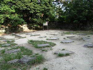 | 伝羽柴秀吉邸跡。大手口の両脇には屋敷地が並んでいる。 | 黒金門の枡形。ここを上がると長谷川秀一邸の跡である。 |