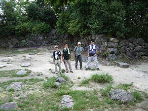 | 天守台。これだけの石垣を築けるのにどうして四角形にしなかったのか不思議である。現状では北側には石垣は無くなっており、石倉の高さもかなり低くなってしまっている。 | 今回参加のレジャー隊メンバー。夜通し走ってきて、早朝ここに着いた。天守台で朝食を食べたのであった。 |
