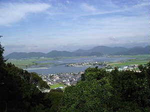 | 総見寺跡から見た風景。比高100mほどだが景色はとても良い。かつてはこの下まで琵琶湖が入り込んできていた。 | 総見寺に残る三重塔。 |
