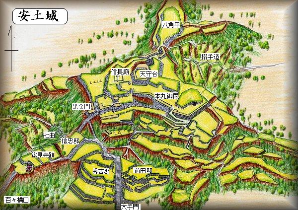 さて、安土城に関しては各種の縄張り図や発掘報告書なども出ているので、それらから想像して鳥瞰図を描いてみた。しかし、この城は対入り禁止になっている区画が非常に多いので、本当にこのとおりになっているかどうかをすべて確認したわけではない。