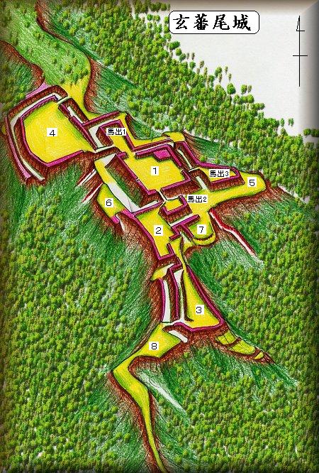 図の1郭は40m四方ほどの郭であるが、この郭には方8mほどの天守台のようなものがあり(実際に建物が建てられていた礎石が出土しているという)、また3つあるすべての虎口に馬出し状の小郭が付属しているので、これを主郭としてみてよいであろう。馬出し1に接続する虎口は土塁が食い違いとなっている。