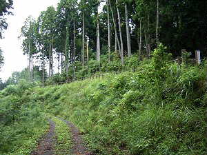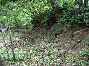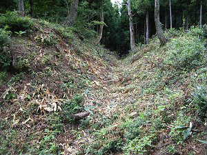 | 1郭と2郭との間の堀切。やはり深さは2mほど。この堀底は2郭外側の横堀に接続している。 | 1郭から東側に延びる竪堀とそのさきに作られた林道。 |