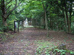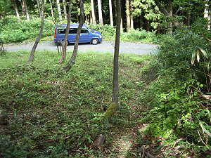| 岩崎山から更にハイキングコースを500mほど進んでいくと、中川瀬兵衛清秀が守り、そして討ち死にを遂げた大岩山砦の跡がある。削平地とわずかな土塁とで構成された単純な陣場である。ここには中川瀬兵衛の供養塔が建っている。 | 下の林道から砦を見たところ。柵が一部復元されている。 |