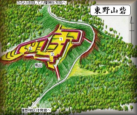 砦には馬出しなど技巧的な面もあるが、基本的には規模は小さく、まさに陣城という感じである。しかし、もともとは地元の豪族であった東野氏の居城が置かれていたところであったという。それを急いで改修して現在見られるような城郭としたものであろう。