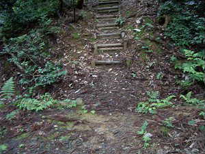 城址に到達できる道は2つある。1つは麓の東野地区体育館から上がっていく林道であるが、この道は急な上にかなり荒れてしまっている。この道ならば10分ほど登ればすぐに城址の脇に着くことができるのであるが、4駆の自動車でないと登るのはかなり難しいであろう。私たちも降りるときにはこの道を利用したのであるが、オートマで4駆でないワゴン車では降りるだけでもかなり怖い道であった。登るのは到底無理であったろう。