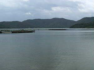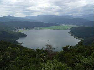 | 余呉湖畔から賤ヶ岳方向を見る。この東側の尾根を通って佐久間玄蕃が攻撃を仕掛けてきた。 | 賤ヶ岳の山頂から余呉湖を望む。中央奥左手の山上に、玄蕃尾城のある内中尾山がある。 |