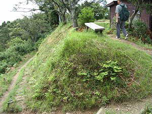 | 余呉湖畔からハイキングコースを登り始めるとすぐに小規模な堀切が見えてくる。 | 山道を登りきったこの辺りが高山右近のいた岩崎山砦であると思われるが、明確な遺構はあまり見られない。 |