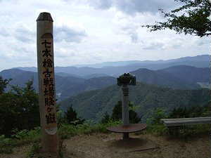 | 賤ヶ岳砦の守将は桑山重晴、浅野弥兵衛、羽田正親らであったという。しかし、行市山方向から佐久間盛政、柴田勝政らの軍隊が攻め寄せてくると、守りきれずに敗走した。佐久間らはさらに北東の尾根続きの大岩山砦をも攻撃して中川瀬兵衛を討ち取る。しかしその夜半には戦場に到着した羽柴軍によって撃退されることとなる。 それにしても羽柴軍は、大垣からの40kmを駆け続けた上、さらに比高300mのこの山を登って佐久間軍を撃退したということに なる。昔の人ってそんなに体力があったものなのだろうか。 |